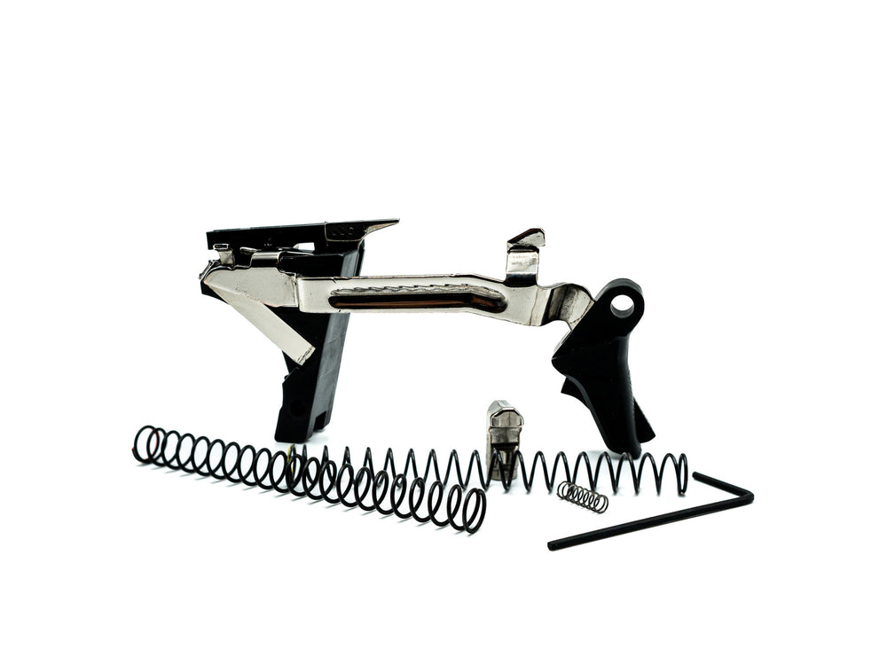 Includes- Full trigger assembly (Glock OEM spec trigger, trigger housing and trigger bar), striker springs 4.5 & 5 lbs, safety plunger w/reduced power 3 lbs spring, hex wrench, and spring configuration chart. **43/x,48's have OEM serrated shoe.